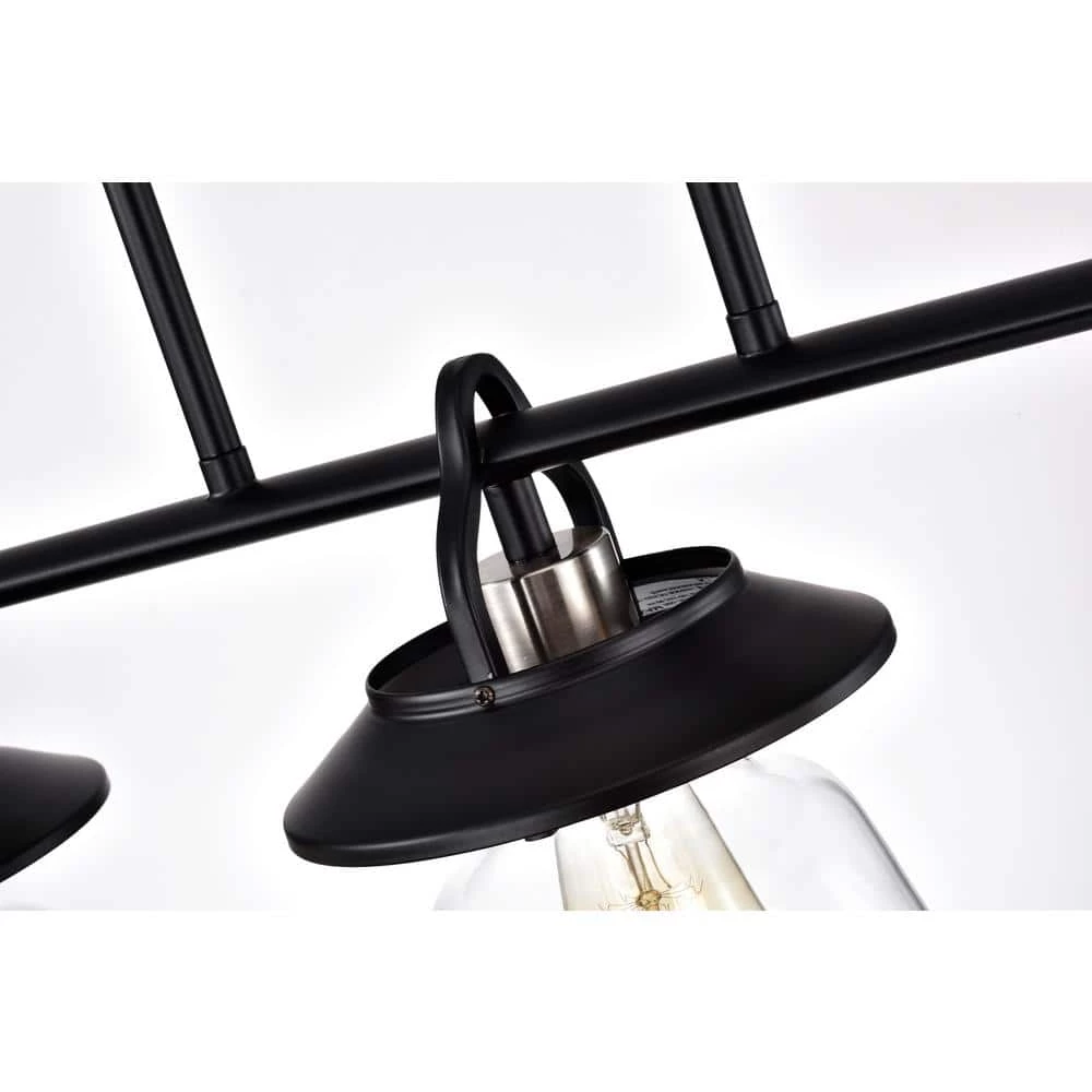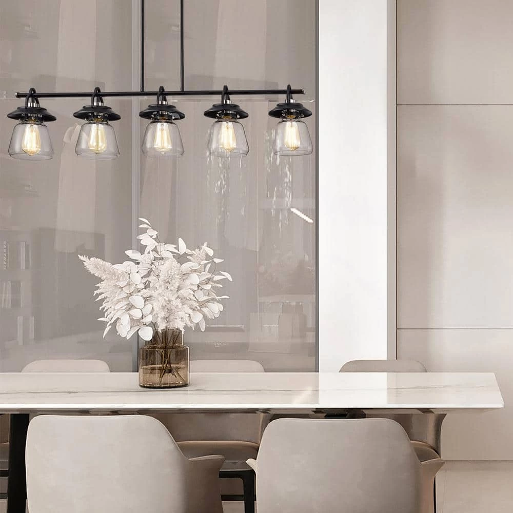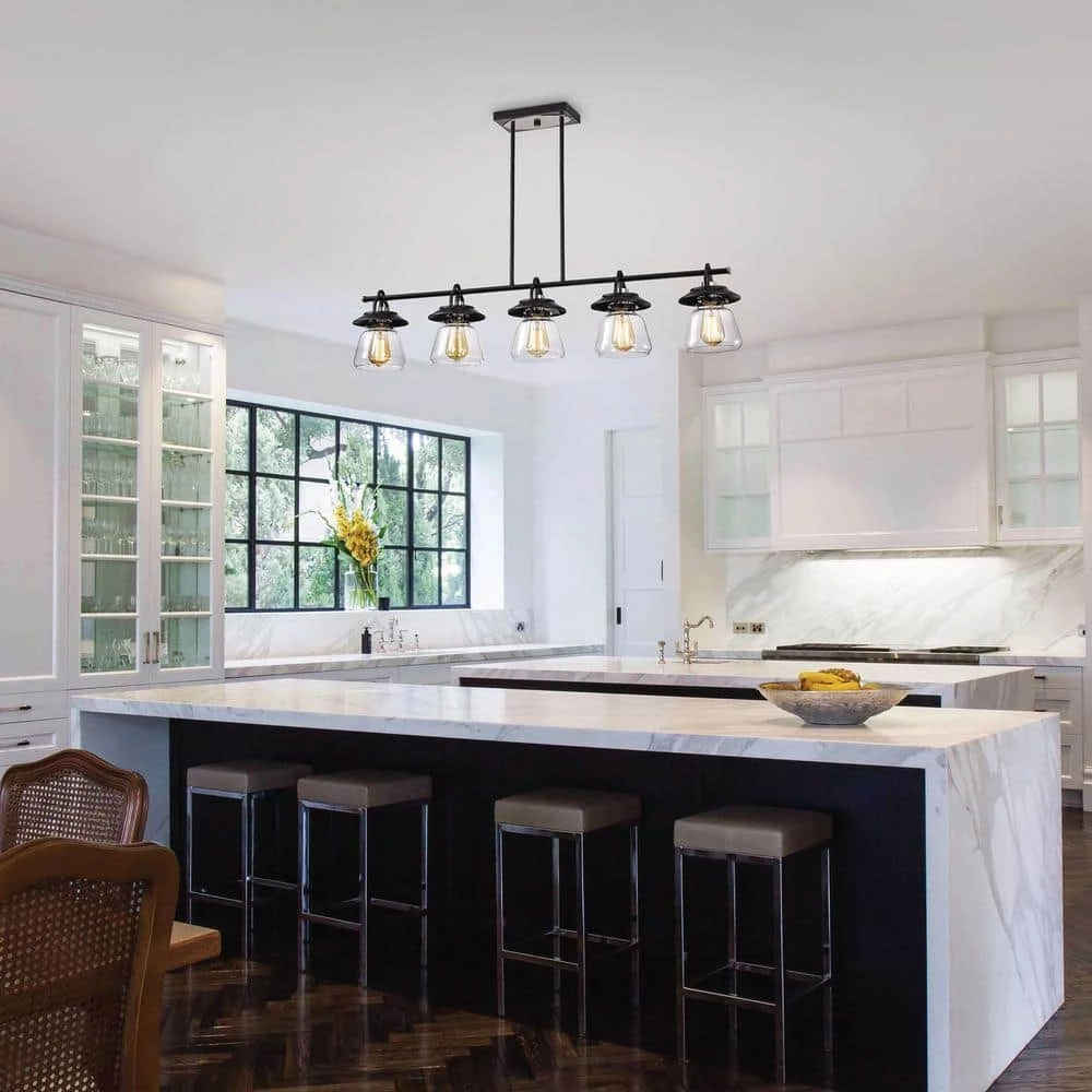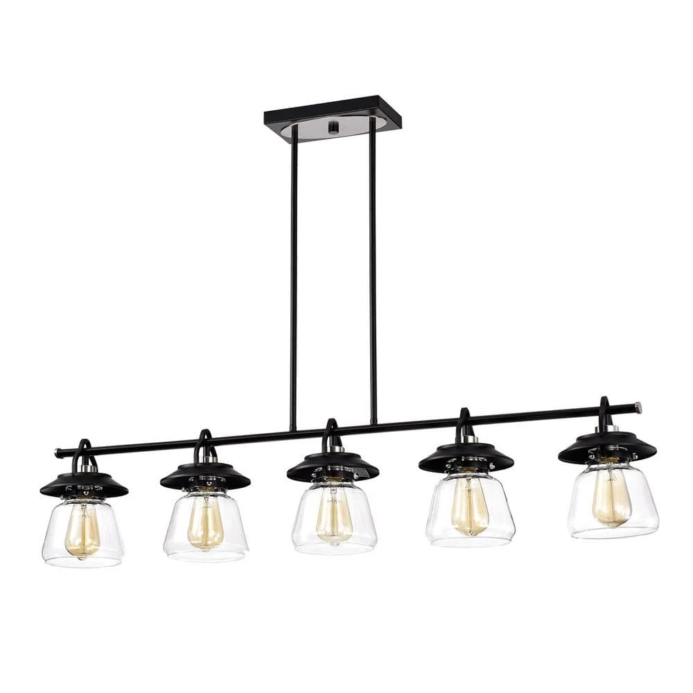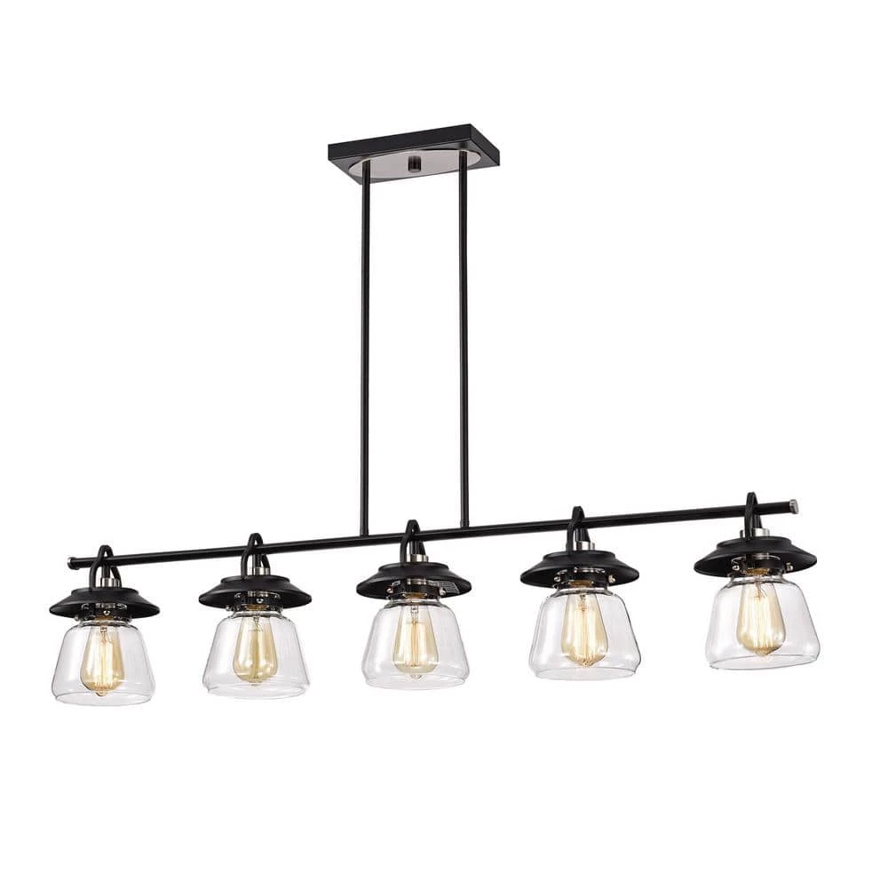Inspired by hanging lanterns, our 5-light pendant is perfect above a kitchen island or dining room. Drawing from traditional styles, this ceiling light fixture transitions to current trends with high contrast elements offered by the black finish and clear shades. The brushed nickel detailing of this kitchen island light adds visual interest tocomplement contemporary furnishings.